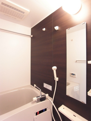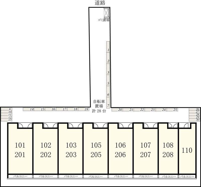 Bicycle parking / On-site garbage station / System kitchen / Two-burner stove / Gas stove / Public water / City gas / Drainage / Sewer / Separate bath and toilet / Independent washbasin / Indoor washer space / Air conditioner / Two-person occupancy allowed / BS terminal / Digital terrestrial TV / Internet ready / Lighting fixtures included / Wood flooring / Balcony / Restaurant use not allowed / Storage space / Shoe box / Video intercom / Dimple key / Double-lock key / 24-hour security / Private bath / Private toilet / Warm water toilet seat / Heated toilet seat / Shower / Reheating function / Bathroom dryer / Washroom / Washbasin with vanity / Hot water supply